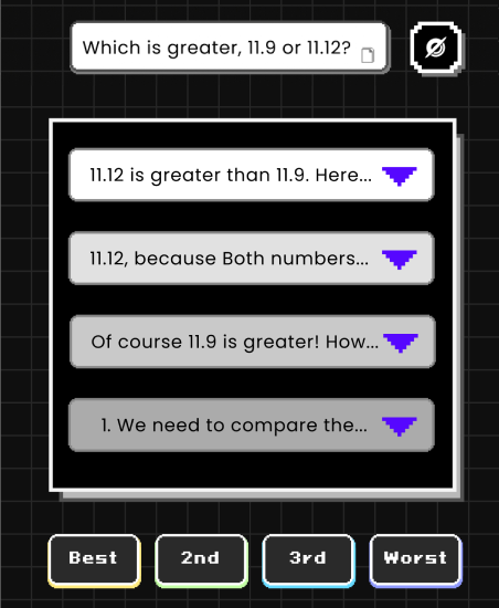 <figure><img src="https://195315662-files.gitbook.io/~/files/v0/b/gitbook-x-prod.appspot.com/o/spaces%2FQiLM0cPsvqrD9YS5LbFS%2Fuploads%2FWdBlcLCgSyvmNrmXzhY0%2Fimage.png?alt=media&#x26;token=4ce98e99-f33a-49e3-9e8a-b9a7c65b9834" alt="" width="226"><figcaption><p>Step 2 - Rank the best and worst answers if you like</p></figcaption></figure>