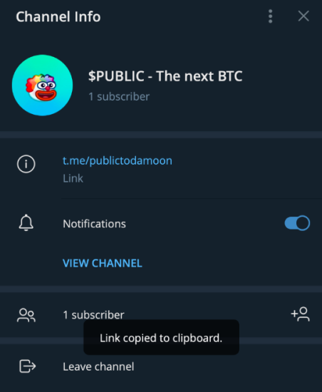 <figure><img src="https://195315662-files.gitbook.io/~/files/v0/b/gitbook-x-prod.appspot.com/o/spaces%2FQiLM0cPsvqrD9YS5LbFS%2Fuploads%2FJbGgnmMlzArKCg6Hql16%2Fimage.png?alt=media&#x26;token=58c07019-2409-41d1-b07f-d15d6e7952b7" alt="" width="226"><figcaption><p>Step 2- Copy the channel link</p></figcaption></figure>